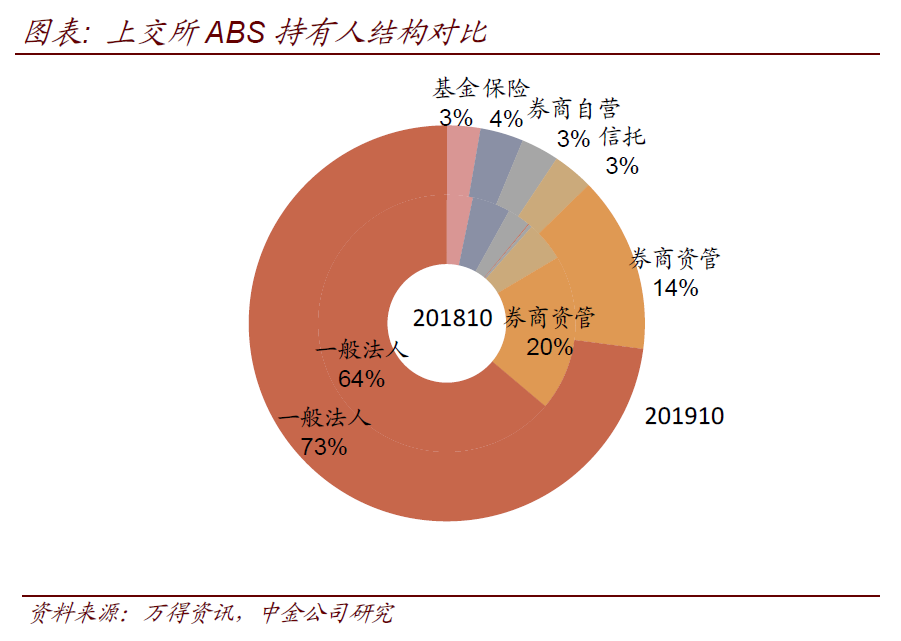 上海證券交易所方面,2019年10月一般法人持倉(cāng)占比高達(dá)73%,券商資管的持倉(cāng)占比14%,合計(jì)87%。對(duì)比去年同期,一般法人持倉(cāng)占比64%,券商資管持倉(cāng)占比20%,合計(jì)84%。數(shù)據(jù)的此消彼長(zhǎng)可能一定程度上體現(xiàn)了通道轉(zhuǎn)換的影響,實(shí)質(zhì)上銀行依然是整個(gè)市場(chǎng)最大的持有方。