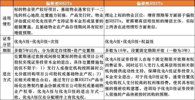 國內(nèi)“類REITs”產(chǎn)品有兩類主要設計思路,分別為偏股型REITs和偏債型REITs。上述四個項目均為偏債性類REITs。偏股型REITs如 華泰佳越-順豐產(chǎn)業(yè)園一期資產(chǎn)支持專項計劃、光證資管-光控安石商業(yè)地產(chǎn)第1-X期資產(chǎn)支持專項計劃。