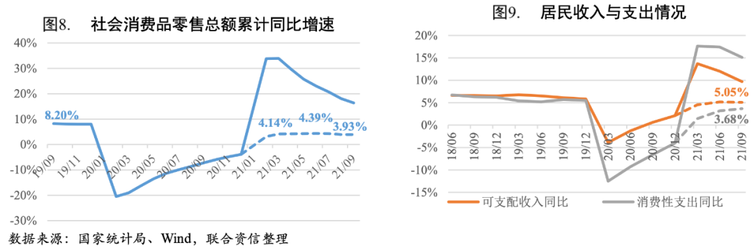 三季度消費復蘇放緩。2021年前三季度,我國社會消費品零售總額31.81萬億元,同比增長16.40%,兩年平均增速3.93%,較上半年兩年平均增速小幅回落,與疫情前水平仍有一定差距,三季度居民人均可支配收入、消費性支出修復同步放緩。中秋節(jié)假期以及十一小長假臨近帶動9月單月消費較8月的低點小幅反彈,疫情對消費的負面影響有所緩解。四季度消費仍會受到點狀散發(fā)疫情影響,但電商購物節(jié)等因素有助于帶動消費提升。
