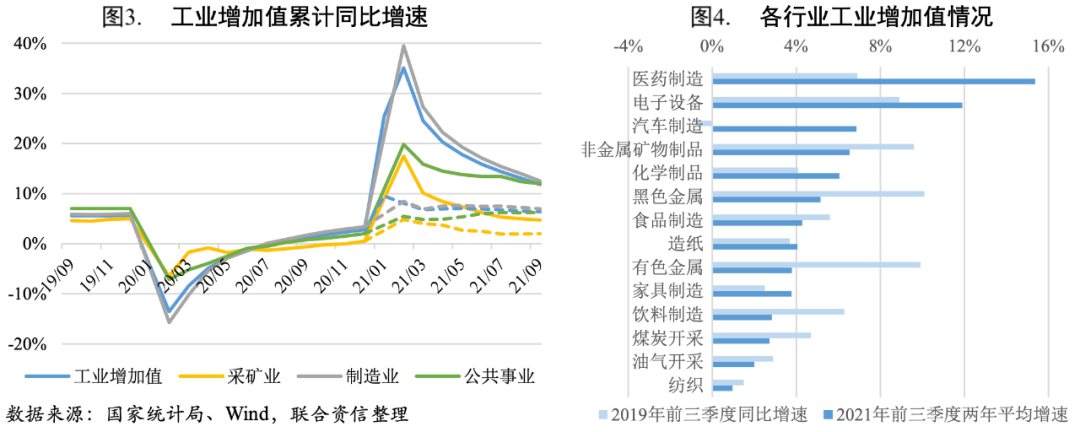主要行業(yè)[3]方面,醫(yī)藥制造業(yè)、計算機、通信和其他電子設備制造業(yè)以及汽車制造業(yè)受出口帶動前三季度工業(yè)增加值兩年平均增速較高,但受芯片、電池等供應鏈短缺影響,三季度特別是8月汽車制造產能擴張承壓;而黑色、有色金屬冶煉及延壓加工業(yè)和非金屬礦物制品業(yè)工業(yè)增加值較2019年下降較大,主要是限電限產等措施對鋼鐵、有色和水泥等高耗能行業(yè)產能負面影響較大,其中黑色金屬冶煉及壓延加工業(yè)工業(yè)增加值兩年平均增速繼續(xù)下滑,除了供給端的限制外,還受到需求端地產降溫的影響。