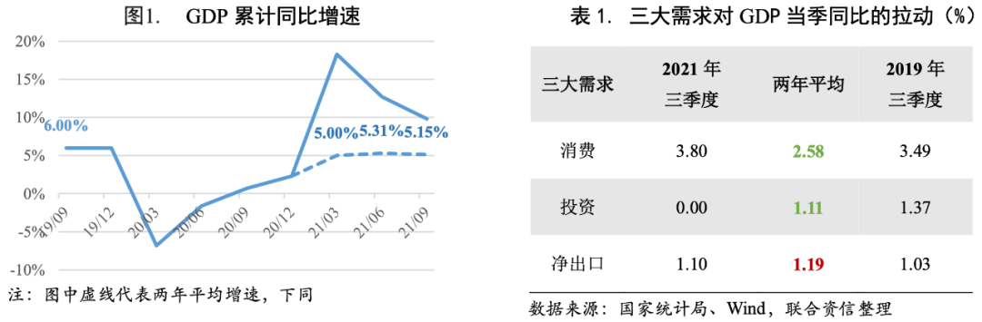 三季度經(jīng)濟修復放緩。三季度我國國內生產總值29.10萬億元,同比增長4.90%,兩年平均增長4.90%,較二季度兩年平均增長(5.52%)有所放緩;三季度環(huán)比增長0.20%也較二季度(1.20%)明顯回落,三季度經(jīng)濟修復動能減弱,消費和投資對經(jīng)濟增長的拉動均不及疫情前同期,僅凈出口拉動作用高于疫情前。2021年前三季度,我國國內生產總值82.31萬億元,不變價累計同比增長9.80%,兩年平均增長5.15%,較上半年兩年平均增速放緩0.16個百分點。