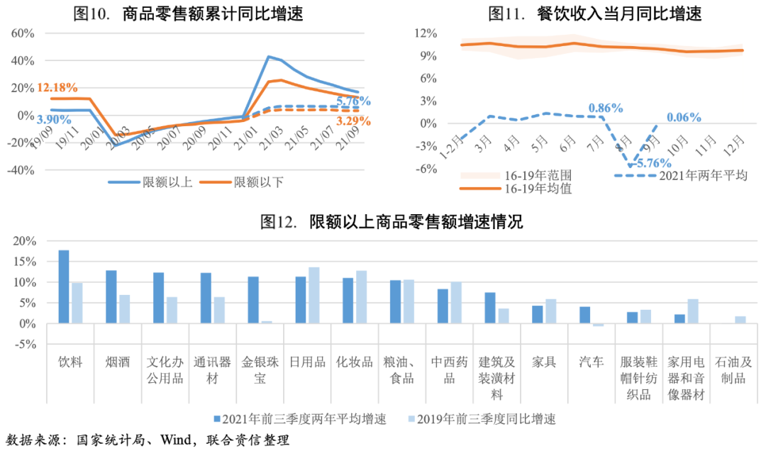 限額以下商品零售和接觸性服務仍是消費的主要拖累,商品零售與疫情前差距主要體現(xiàn)在限額以下的部分,限額以上商品零售額兩年平均增速均為正值,汽車銷售自二季度以來受芯片供應短缺以及排放標準升級切換期等影響,兩年平均增速持續(xù)放緩,9月當月汽車零售額兩年平均增速再次落入負值區(qū)間。三季度餐飲收入波動較大,8月受疫情沖擊大幅回落,9月回升至正值,接觸性消費由于對疫情變化更為敏感,整體波動較大且較疫情前水平差距較大。