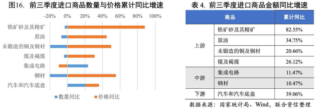 三季度以來,進口增速呈現(xiàn)逐步下行的趨勢,部分大宗商品量減價揚,國際大宗商品價格的上漲抑制了部分國內需求。從主要進口商品看,前三季度鐵礦砂及其精礦是進口增速的主要支撐項,但從三季度開始,其進口數(shù)量也逐步下行,或與國內房地產投資走弱相關。四季度,各地“雙限”政策的實施疊加冬季環(huán)保政策,或將導致國內工業(yè)生產放緩,導致對海外原料的需求下降,預計進口將出現(xiàn)金額和數(shù)量雙降。