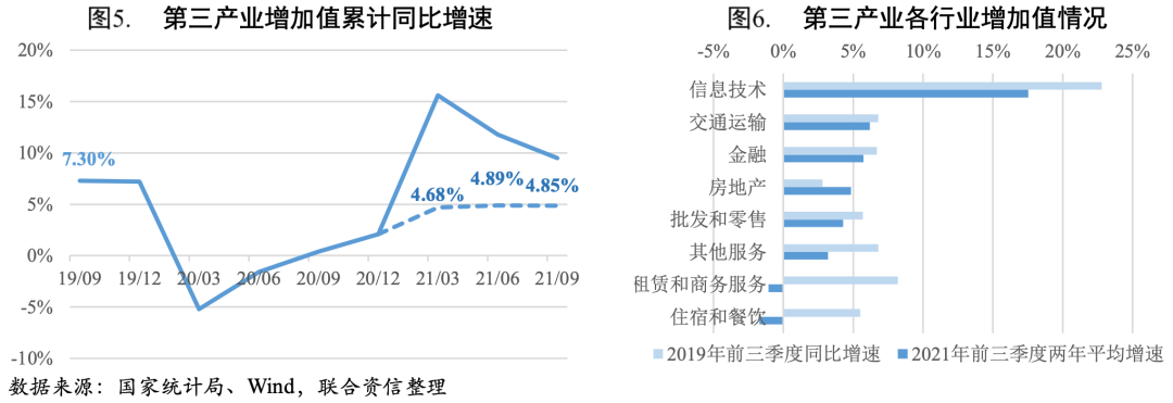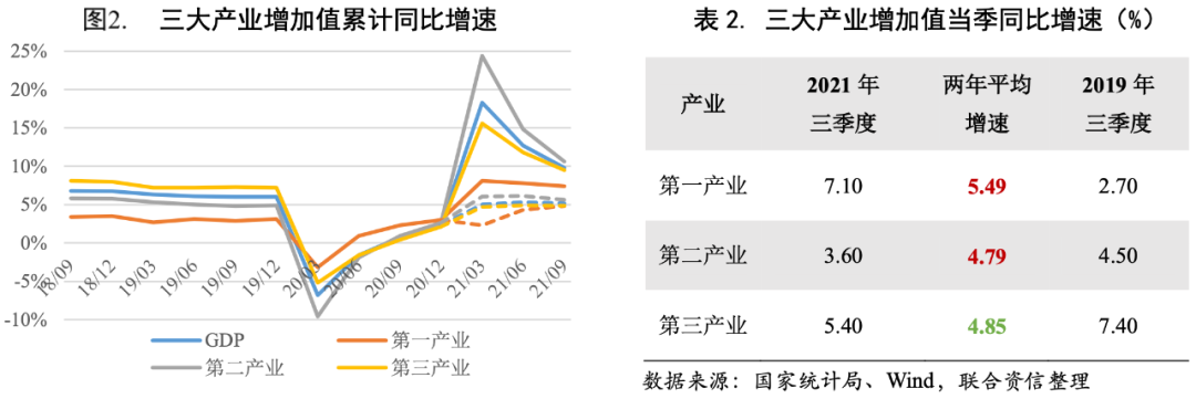 從三大產業(yè)來看,三季度第一、二產業(yè)增加值兩年平均增速[2]均高于疫情前2019年同期的水平,恢復情況良好;而第三產業(yè)增加值兩年平均增速仍未回到疫情前水平,主要是服務業(yè)受局部疫情反復影響較大。