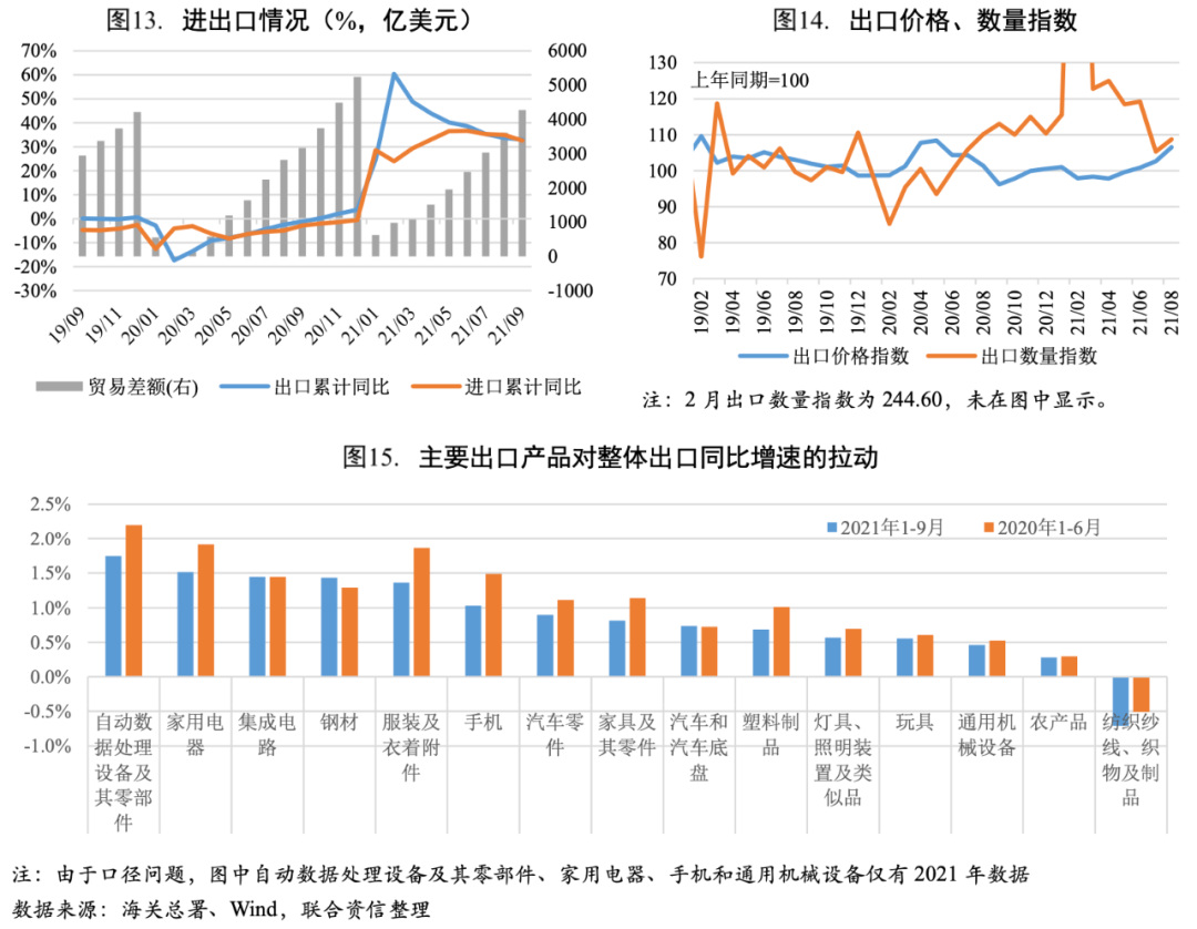 三季度出口增速有所放緩,主要是由于上年基數(shù)抬高。全球經(jīng)濟和貿易回暖帶來的需求增加是支撐我國出口的主要因素,但三季度以來出口價格上漲對出口金額的貢獻度上升,集成電路、手機和家用電器等受大宗商品漲價明顯的行業(yè),出口均表現(xiàn)出量減價增的特點。從三季度主要出口產品對整體出口同比增速的拉動來看,自動數(shù)據(jù)處理設備及其零部件、家用電器和集成電路依然是出口的最大拉動項;紡織紗線、織物及制品對出口的負向拉動進一步增大。四季度,海外需求修復疊加出口價格上漲或將支撐出口依然保持在較高的水平,但在上年基數(shù)抬高的因素影響下,四季度整體出口增速將小幅下行。