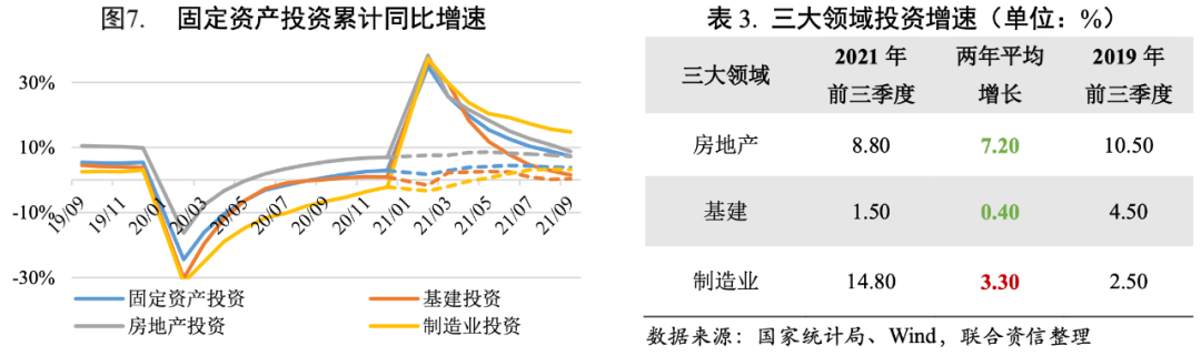 三季度固定資產投資有所放緩。2021年前三季度,全國固定資產投資(不含農戶)39.78萬億元,同比增長7.30%;兩年平均增長3.80%,比上半年兩年平均增長放緩0.60個百分點,三季度固定投資增長有所放緩,前三季度固定投資三大領域中僅制造業(yè)投資兩年平均增長回到疫情前水平。