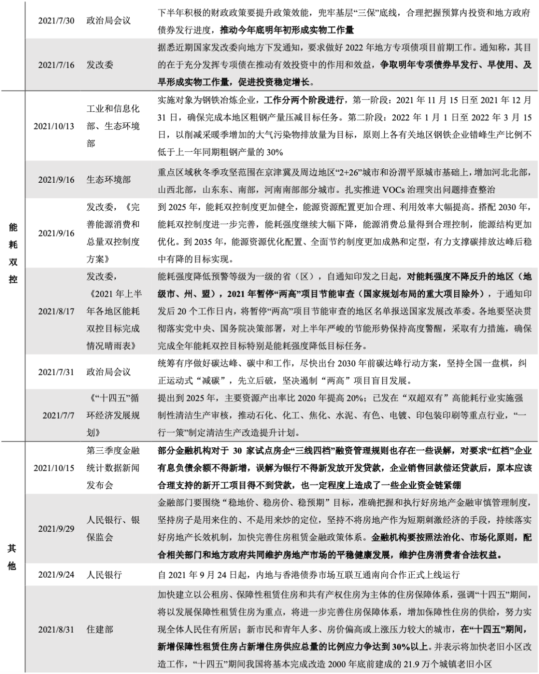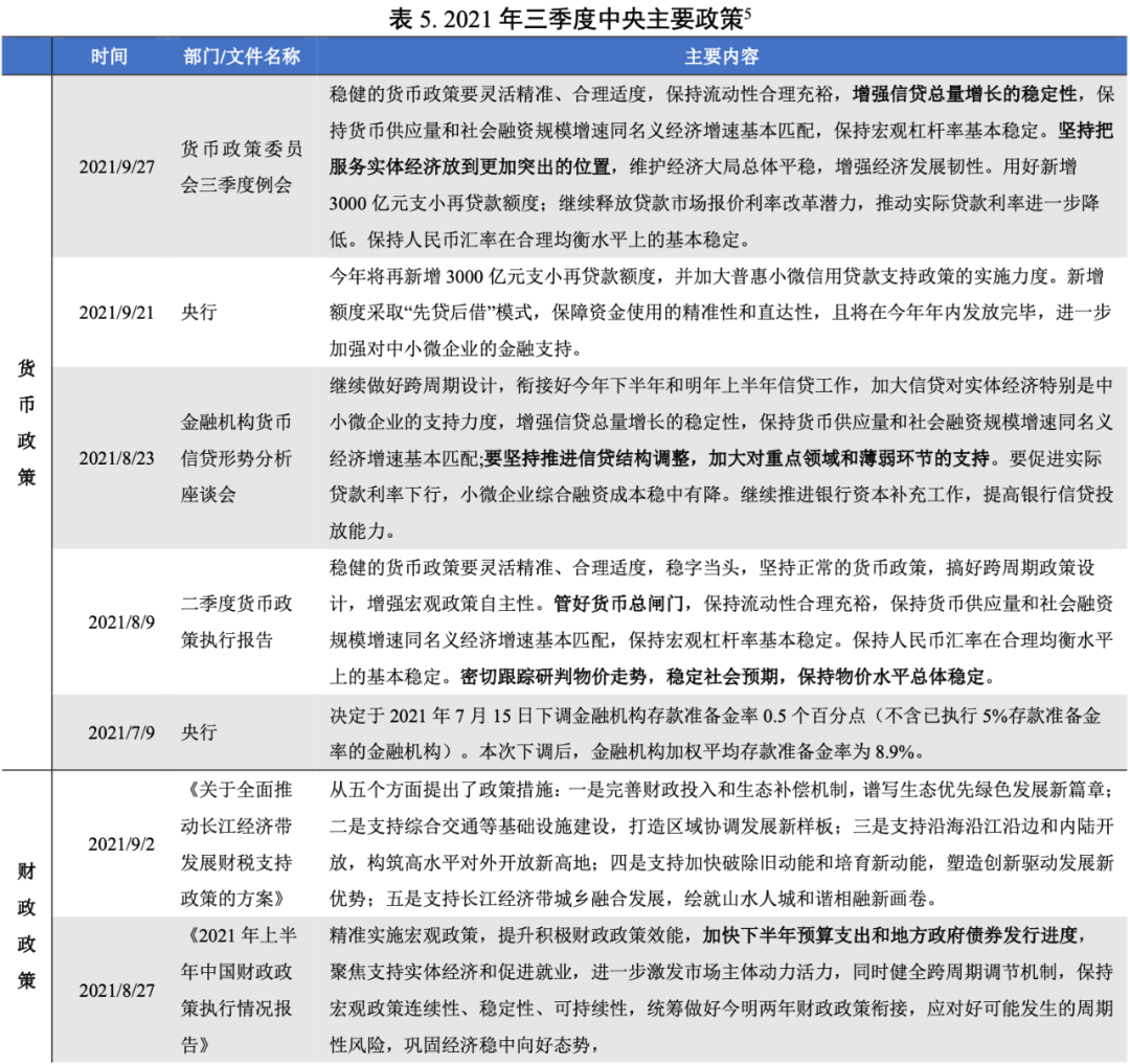 2021年三季度,貨幣政策方面,年內首次下調金融機構存款準備金率0.5個百分點釋放長期資金約1萬億元,新增3000億元支小再貸款額度加大支持小微企業(yè)力度,整體來看三季度信貸總量增長穩(wěn)定,同時突出信貸結構調整;財政政策方面,地方政府債的發(fā)行進度有所加快,財政支出呈增長趨勢。“碳中和”要求與“能耗雙控”行動下,限電限產政策在三季度有所加碼。