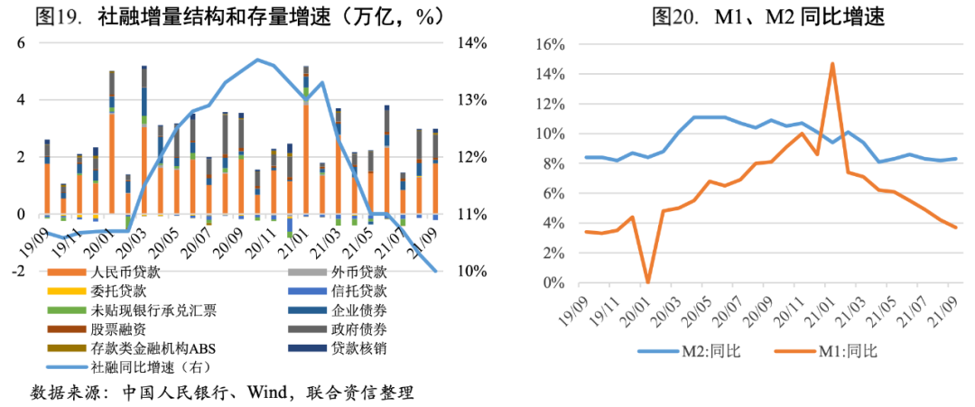 2021年三季度,社融增速延續(xù)上半年的回落趨勢,貨幣供應量和社會融資規(guī)模的增速同名義經(jīng)濟增速基本匹配。截至9月末,M2的余額是234.28萬億元,同比增長8.3%,比上半年低0.3個百分點,社融存量余額為308.05萬億元,同比增長10%,比上半年低1個百分點。從結構看,三季度,人民幣貸款是新增社融的主要支撐項;政府債券和企業(yè)債券融資同比大幅下降,與2019年同期基本持平,政府債券和企業(yè)債券的融資回歸常態(tài);表外融資大幅減少,是拖累新增社融規(guī)模的主要因素。