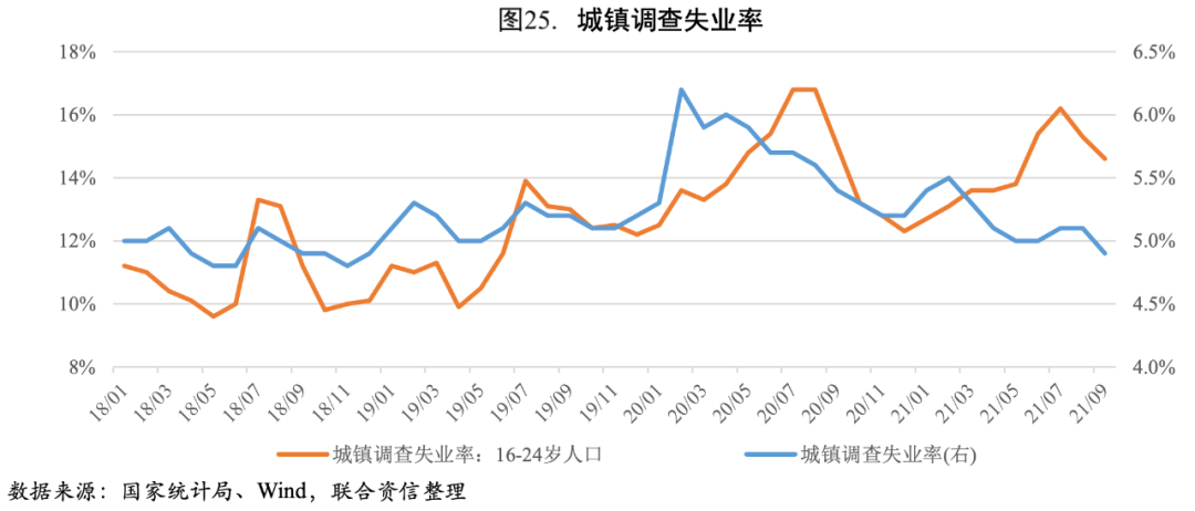 2021年以來就業(yè)形勢總體基本穩(wěn)定,調查失業(yè)率呈逐季穩(wěn)中有降的趨勢。前三季度,城鎮(zhèn)新增就業(yè)1045萬人,完成全年目標任務的95%;城鎮(zhèn)調查失業(yè)率均值為5.2%,低于全年5.5%左右的預期目標。從結構看,重點群體就業(yè)情況在三季度出現(xiàn)改善,其中16-24歲城鎮(zhèn)人口失業(yè)率結束自2021年1月以來的連續(xù)上升,自8月開始出現(xiàn)下降;截至三季末,農村外出務工勞動力總量同比增長2%,基本恢復至疫情前2019年同期水平。就業(yè)形勢基本穩(wěn)定的同時,依然存在新增就業(yè)人數(shù)完成進度慢于往年同期的總量壓力,以及部分群體失業(yè)率依然較高和沿海一些地區(qū)缺工的結構性矛盾,四季度保持就業(yè)穩(wěn)定的壓力依然存在。