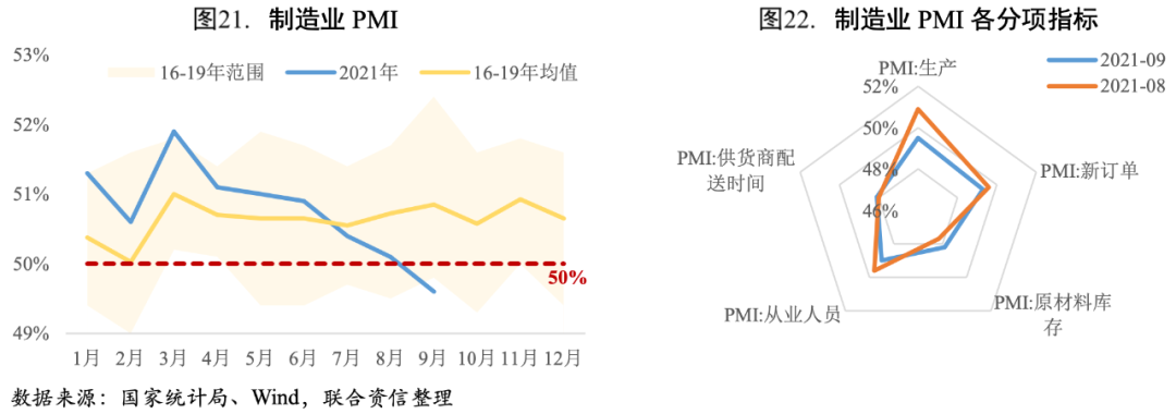 2021年三季度制造業(yè)PMI呈現(xiàn)逐月小幅下降的趨勢,9月制造業(yè)PMI跌至49.6%,產需兩端均降至榮枯線下,制造業(yè)生產活動和市場需求總體放緩。從行業(yè)角度看,在調查的21個行業(yè)中,有12個高于臨界點,比上月增加2個,但石油煤炭及其他燃料加工、化學纖維及橡膠塑料制品、黑色金屬冶煉及壓延加工等高耗能行業(yè)生產和新訂單兩個指數(shù)均進一步下滑至45.0%以下,反映了9月制造業(yè)PMI降至榮枯線下更多的是受高能耗行業(yè)影響。