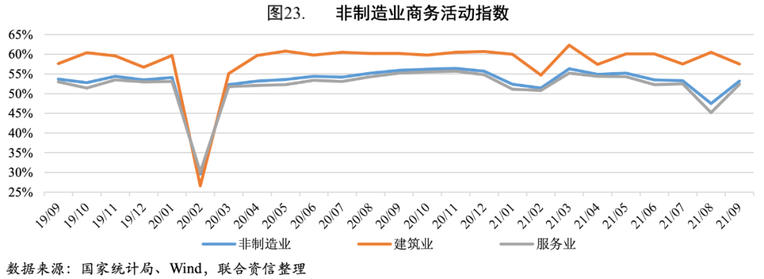 2021年三季度非制造業(yè)商務活動指數(shù)呈現(xiàn)V型,8月降至榮枯線以下,9月重回擴張區(qū)間。9月份,非制造業(yè)商務活動指數(shù)為53.2%,高于上月5.7個百分點,升至臨界點以上,非制造業(yè)景氣水平快速回升,其中服務業(yè)恢復明顯,建筑業(yè)仍位于較高景氣區(qū)間。