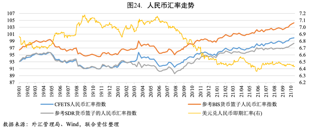 2021年以來,美元兌人民幣匯率雙向寬幅波動,三季度以來波動區(qū)間收窄;人民幣三大匯率指數(shù)延續(xù)2020年下半年以來的升值趨勢,主要是由于我國經(jīng)濟相對較好且國內疫情顯著好于海外,支撐人民幣匯率指數(shù)堅挺。四季度,預計人民幣三大匯率指數(shù)或將小幅貶值,主要是由于四季度我國經(jīng)濟恢復的挑戰(zhàn)增多,與海外經(jīng)濟體的經(jīng)濟優(yōu)勢收窄,且各經(jīng)濟體生產受疫情影響的敏感性下降;Taper臨近疊加美國經(jīng)濟在疫苗接種和強有力政策支持下繼續(xù)改善,人民幣兌美元匯率將面臨一定的貶值壓力,但中美關系緩和利好人民幣,所以整體貶值壓力可控。