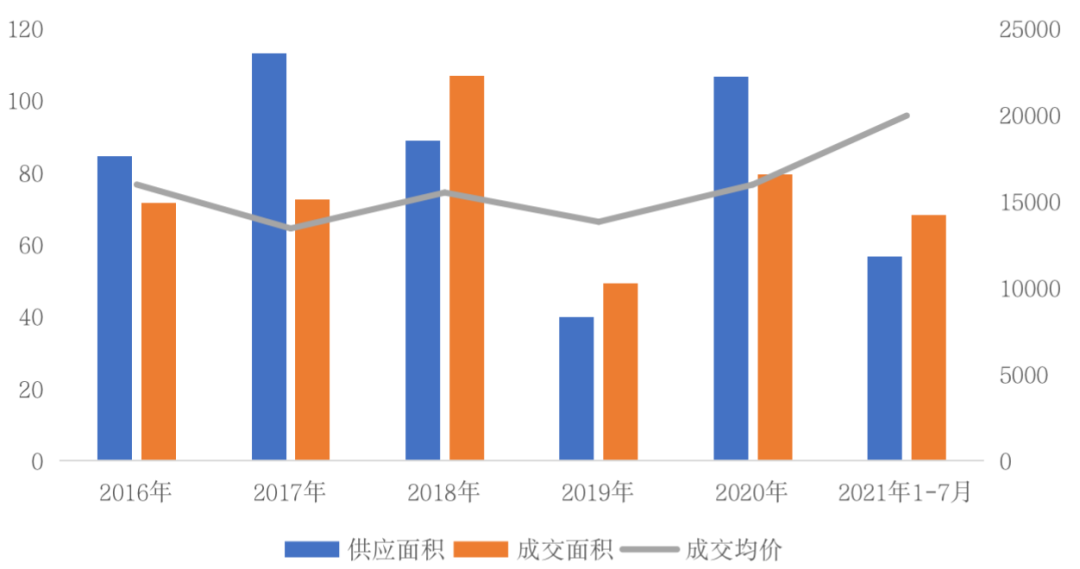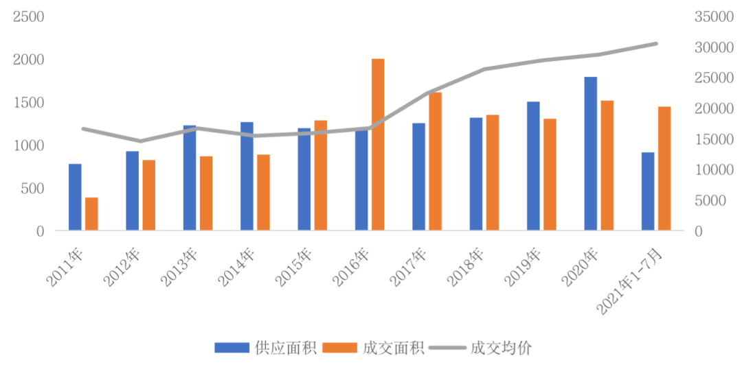 圖:2011年-2021年前7月杭州商品住宅供求量?jī)r(jià)(單位:萬平方米、元/平方米)