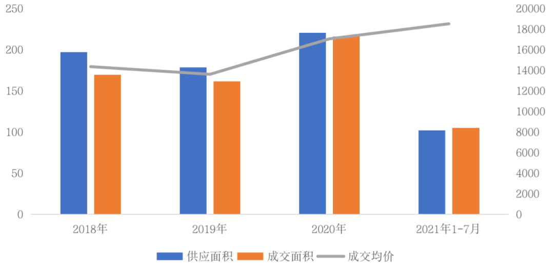 圖:2018年-2021年前7月金華主城區(qū)商品住宅供求量?jī)r(jià)(單位:萬平方米、元/平方米)