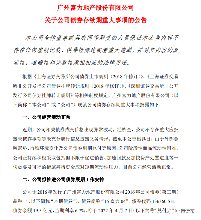 據(jù)了解,“16富力04”將于2022年4月7日到期兌付,但富力地產(chǎn)預計無法籌措到足額兌付資金,擬與債券持有人溝通債券展期事宜。
