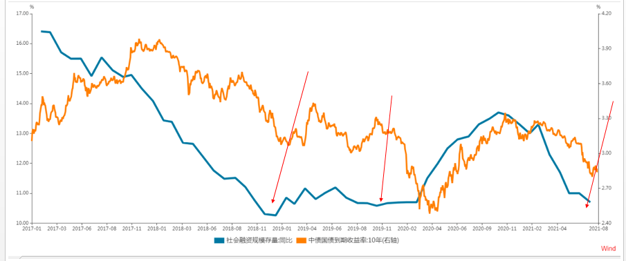 我們?cè)倏磦袌?chǎng)。拋開2020年初的疫情因素,整體上,我們看到了信貸的脈沖和十年期國(guó)債收益率也是高度正相關(guān)。