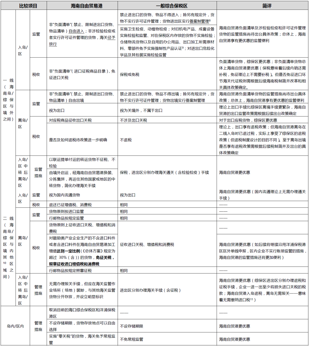 為便于進一步了解海南自貿(mào)港海關(guān)監(jiān)管特殊區(qū)域制度,我們將其與一般的海關(guān)特殊監(jiān)管區(qū)域(以綜合保稅區(qū)(以下簡稱“綜保區(qū)”)為例)做了比較說明(詳見附件表格)。