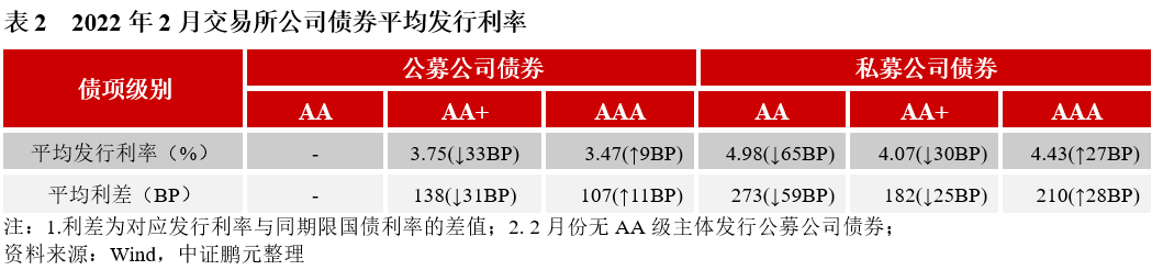 就發(fā)行利率而言,2022年2月份交易所公司債券的最高利率為8.0%,較上月最高利率下降50BP;最低發(fā)行利率為2.15%,較上月最低利率下降15BP。與1月份相比,公募公司債券方面,AAA級(jí)平均發(fā)行利率上行9BP、利差擴(kuò)大11BP,AA+級(jí)平均發(fā)行利率下行33BP,利差收窄31BP;私募公司債券方面,AAA級(jí)平均發(fā)行利率上行27BP、利差擴(kuò)大28BP,AA+級(jí)平均發(fā)行利率下行30BP,利差收窄25BP,AA級(jí)平均發(fā)行利率下行65BP、利差收窄59BP。AA+和AAA級(jí)私募公司債的發(fā)行利率和發(fā)行利差仍倒掛,但差值較上月收窄。