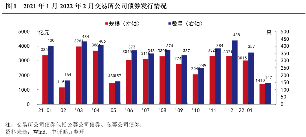 2022年2月份,我國(guó)交易所市場(chǎng)共發(fā)行信用債券155只,發(fā)行規(guī)模1,709.10億元。交易所信用債券發(fā)行環(huán)比分別下降57%和45%,同比分別下降8%和增長(zhǎng)45%。2月份,公募公司債發(fā)行70只,發(fā)行規(guī)模843.05億元,環(huán)比分別下降48%和46%,同比分別增長(zhǎng)112%和120%;私募公司債發(fā)行77只,發(fā)行規(guī)模567.00億元,環(huán)比分別下降65%和61%,同比分別下降41%和26%。可轉(zhuǎn)債發(fā)行8只,發(fā)行規(guī)模299.05億元,環(huán)比分別增長(zhǎng)33%和195%,同比分別增長(zhǎng)167%和11倍。綜合1-2月來(lái)看,交易所債券市場(chǎng)共發(fā)行信用債券518只,發(fā)行規(guī)模4,825.49億元,比2021年同期相比發(fā)行數(shù)量和規(guī)模分別下降11%和增長(zhǎng)1%。其中,公募公司債發(fā)行規(guī)模累計(jì)同比增幅為53%,私募公司債發(fā)行規(guī)模累計(jì)同比下降31%。1-2月份,無(wú)可交換債券發(fā)行。