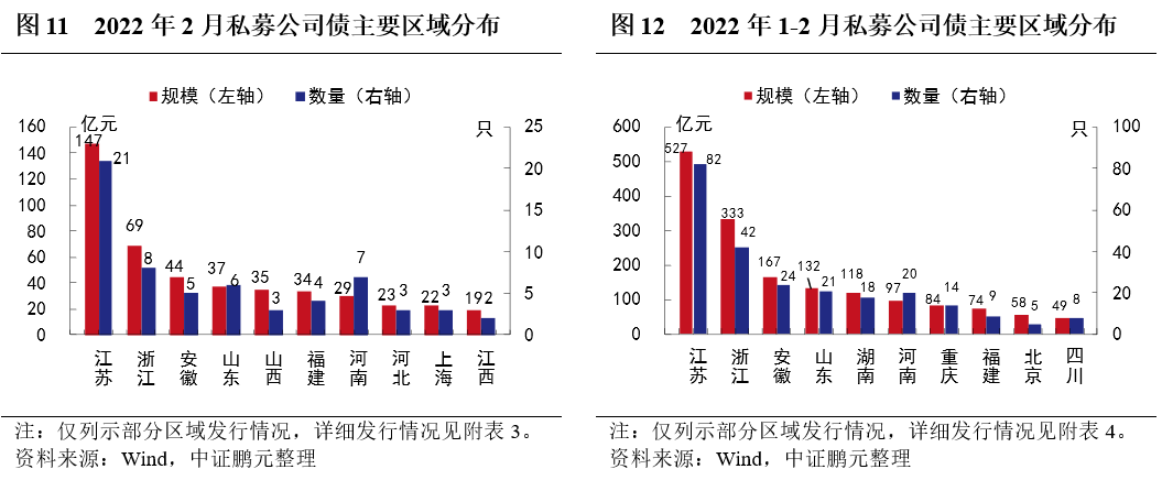 私募公司債券方面,2022年2月份,公募公司債券的發(fā)行人分布于21個(gè)地區(qū),以江蘇、浙江、安徽等地為主。從發(fā)行規(guī)模來(lái)看,江蘇發(fā)行146.63億元位居榜首,浙江發(fā)行68.50億元位居第二,安徽發(fā)行44.40億元位居第三位,發(fā)行數(shù)量分別為21只、8只、5只。浙江、安徽、福建分別以累計(jì)凈融資68.50億元、44.40億元、29.20億元位于前三位,廣東、云南、上海分別凈償還14.80億元、13.30億元、13.00億元。綜合1-2月,江蘇以發(fā)行82只、累計(jì)發(fā)行規(guī)模527.28億元位居首位,遠(yuǎn)高于其地區(qū);浙江以發(fā)行42只、累計(jì)發(fā)行規(guī)模333.12億元位居第二;安徽以發(fā)行24只、累計(jì)發(fā)行規(guī)模167.40億元位居第三;浙江、安徽、江蘇分別以累計(jì)凈融資278.50億元、153.79億元、146.88億元位于前三位,北京、廣西、上海分別凈償還33.00億元、20.71億元、20.47億元。