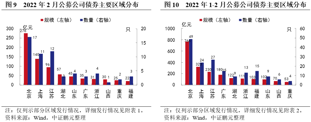 公募公司債券方面,2022年2月份,公募公司債券發(fā)行人分布于18個(gè)地區(qū),以北京、上海、江蘇為主。從發(fā)行規(guī)模來(lái)看,北京發(fā)行276.00億元位居榜首,上海發(fā)行140.00億元位居第二位,江蘇發(fā)行95.60億元位居第三位;從發(fā)行數(shù)量來(lái)看,北京、上海、江蘇分別以發(fā)行17只、11只、12只位于前三位。北京、上海、江蘇分別以累計(jì)凈融資169.00億元、96.91億元、91.10億元位于前三位,廣東、重慶、安徽分別凈償還79.06億元、13.40億元、3.87億元。綜合1-2月,北京以766.00億元的發(fā)行規(guī)模仍位居首位,上海以323.00億元的發(fā)行規(guī)模位居第二位,江蘇以229.80億元的發(fā)行規(guī)模位居第三位,累計(jì)發(fā)行數(shù)量分別為49只、24只、27只。北京、江蘇、上海分別以累計(jì)凈融資405.24億元、215.30億元、156.01億元位于前三位,天津、內(nèi)蒙古、遼寧分別凈償還26.50億元、11.91億元、3.00億元。