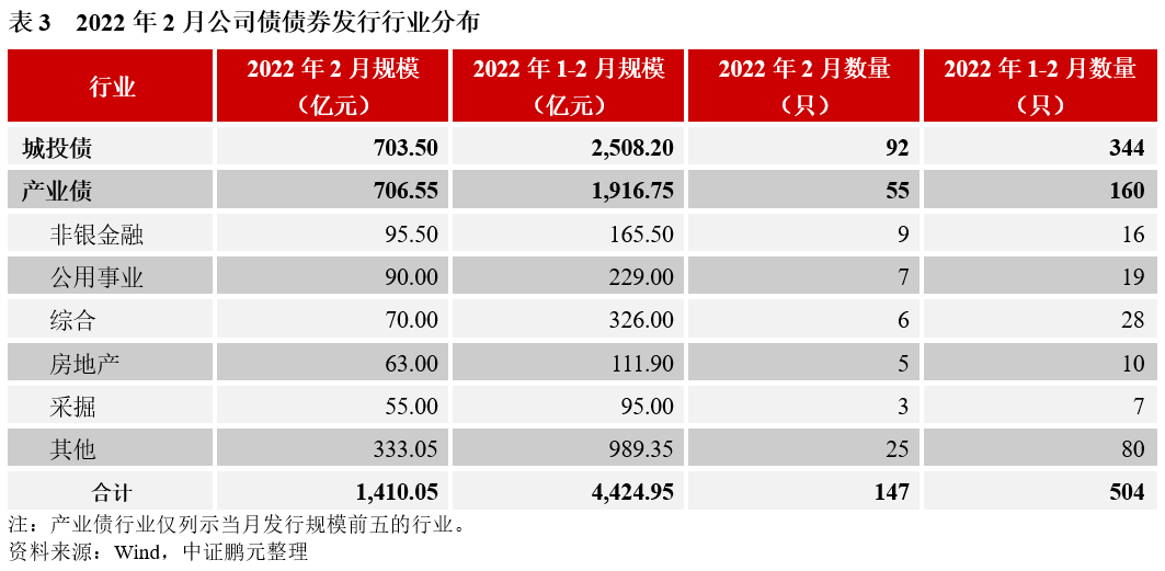 2022年2月份,交易所公司債券中城投債發(fā)行規(guī)模占比50%,產(chǎn)業(yè)債的發(fā)行人主要分布于非銀金融和公用事業(yè)。具體來(lái)看,交易所城投債發(fā)行92只,占比63%,發(fā)行規(guī)模703.50億元,占比50%,該占比較1月份下降了10個(gè)百分點(diǎn)。交易所產(chǎn)業(yè)債發(fā)行55只,發(fā)行規(guī)模706.55億元。產(chǎn)業(yè)債券中,非銀金融行業(yè)發(fā)行9只,占比6%,發(fā)行規(guī)模95.50億元,占比7%,位居產(chǎn)業(yè)債首位;其次是公用事業(yè)行業(yè),發(fā)行7只,占比為5%,發(fā)行規(guī)模90.00億元,占比6%,位于第二;房地產(chǎn)行業(yè),發(fā)行5只,占比為3%,發(fā)行規(guī)模63.00億元,占比4%,位于產(chǎn)業(yè)債第四位。綜合2022年1-2月份的發(fā)行情況來(lái)看,交易所城投債發(fā)行2,508.20億元;產(chǎn)業(yè)債發(fā)行1,916.75億元,其中綜合類(lèi)和公用事業(yè)行業(yè)分別累計(jì)發(fā)行326.00億元和229.00億元位于前兩位,遠(yuǎn)高于其他行業(yè);房地產(chǎn)行業(yè)以累計(jì)發(fā)行111.90億元,位于第六位。