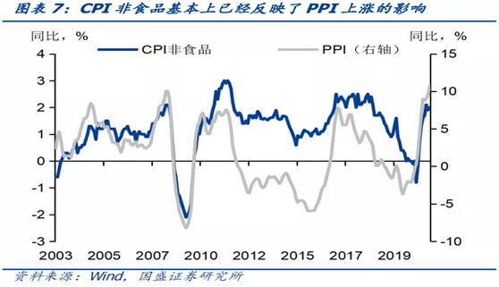 實(shí)際上,PPI向CPI的傳導(dǎo)早已就開(kāi)始。據(jù)國(guó)盛證券表示,以非食品CPI走勢(shì)已反映了工業(yè)品價(jià)格上升影響,與PPI走勢(shì)高度同步。