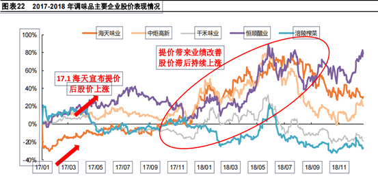 統(tǒng)計(jì)上述主要調(diào)味品16—18年間股價(jià)變動(dòng),在提價(jià)公布后短期內(nèi)股價(jià)均處于上漲狀態(tài)。
