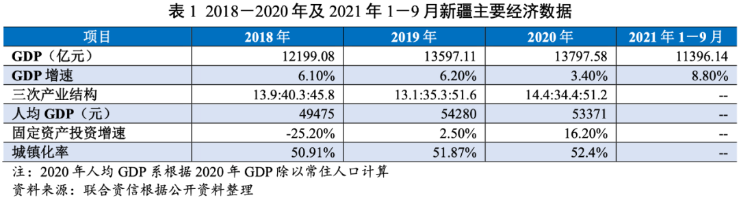 新疆地處中國西北部,戰(zhàn)略地位重要,資源豐富。新疆經(jīng)濟總量和人均GDP位于全國中下游水平,產(chǎn)業(yè)結(jié)構(gòu)以工業(yè)和第三產(chǎn)業(yè)為主。2018-2020年,新疆經(jīng)濟保持增長,2020年受疫情等因素影響,GDP增速有所下降;2021年前三季度,新疆GDP同比增長8.8%。