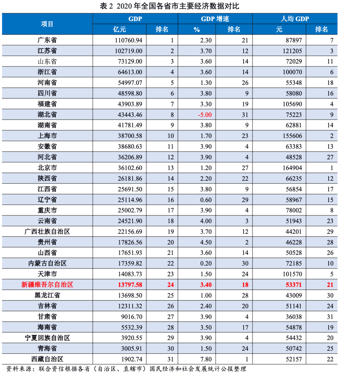經(jīng)濟運行方面,2018-2020年新疆經(jīng)濟不斷增長,但2020年受疫情等因素影響,增速有所放緩。2020年,新疆GDP總量在全國排名第24位,處于全國中下游水平。2018-2020年,新疆GDP增速波動下降,分別低于全國GDP增速0.50個百分點、高于全國增速0.10個百分點和高于全國增速1.10個百分點。2018-2020年,新疆人均GDP逐年提高,但低于全國水平,分別為全國人均GDP的76.53%、76.57%和73.67%。固定資產(chǎn)投資方面,2018-2020年,新疆固定資產(chǎn)投資增速持續(xù)增長,2018-2019年低于全國增速31.10個百分點和2.60個百分點,2020年高于全國增速13.50個百分點。