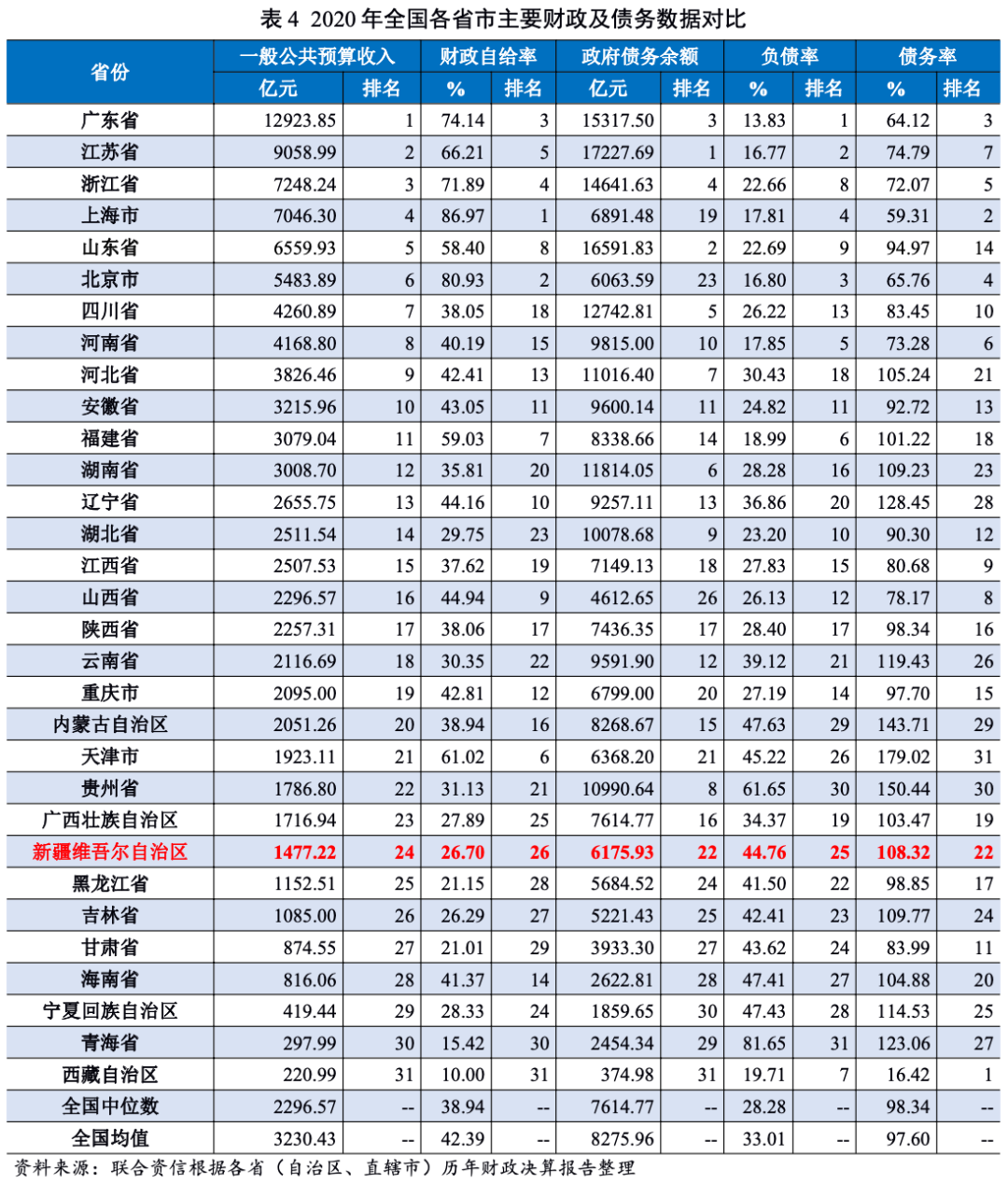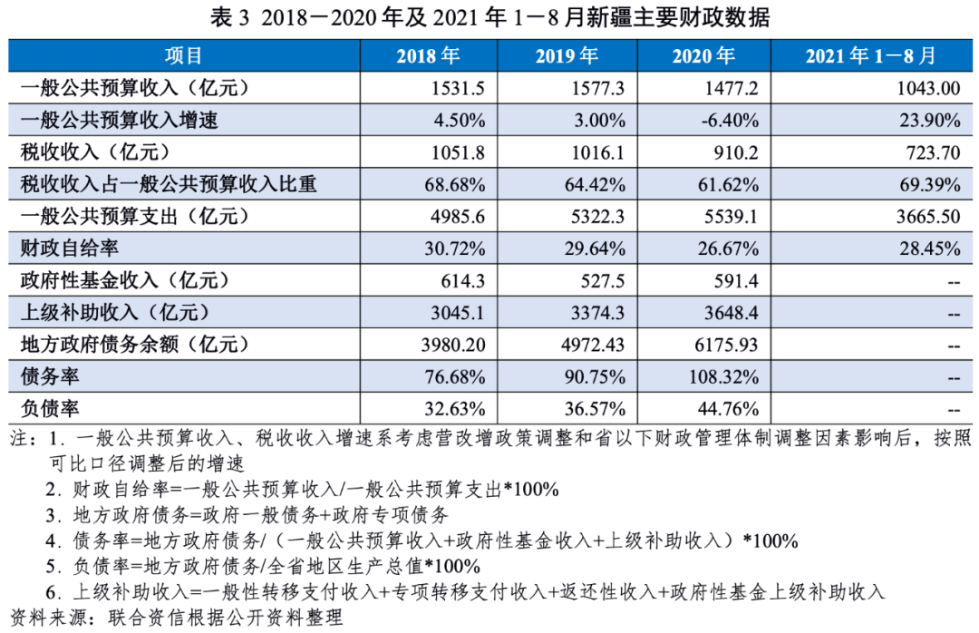 新疆一般公共預(yù)算收入居于全國中下游水平,財政自給能力較弱,政府性基金收入占新疆綜合財力的比重不高,地方可用財力對上級補助的依賴程度高。新疆政府債務(wù)余額在全國排22位,負債率和債務(wù)率在全國排名中下游水平,政府債務(wù)負擔(dān)處于可控范圍。
