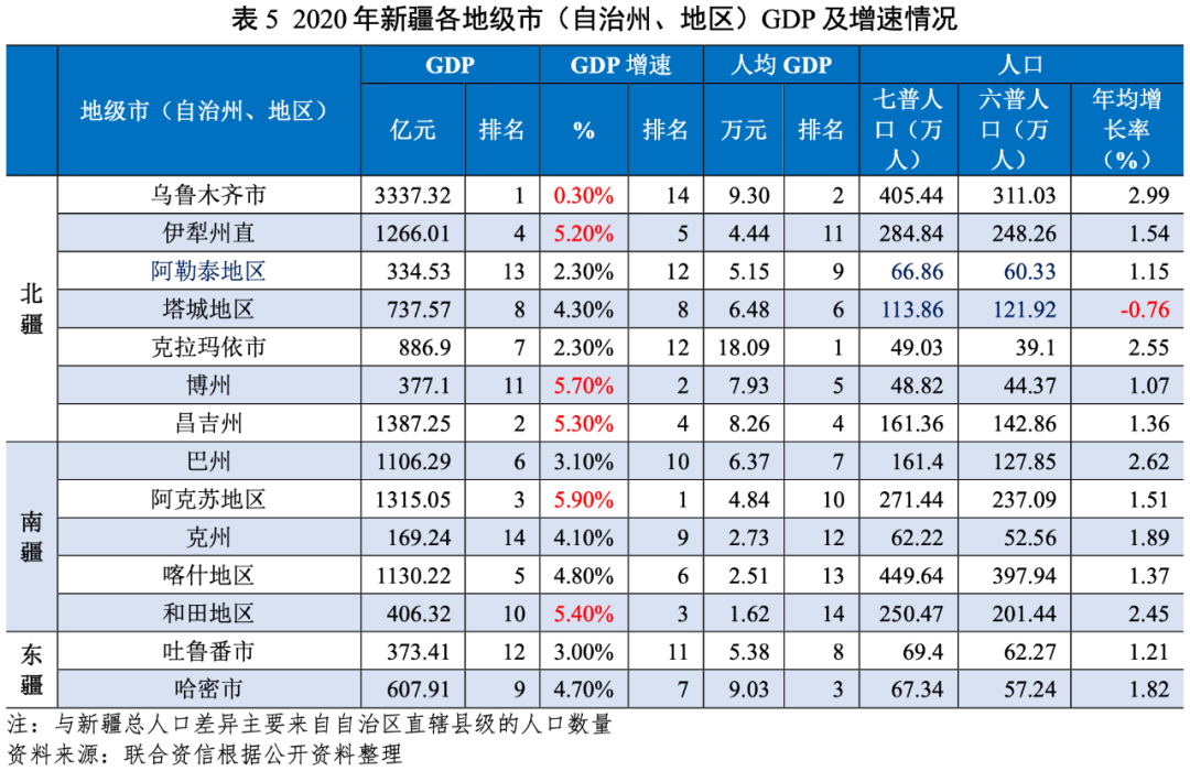 新疆各地級市(自治州、地區(qū))經(jīng)濟發(fā)展相對不均衡,分化較為明顯,烏魯木齊市的GDP遠高于新疆其他地級市(自治州、地區(qū)),昌吉州、伊犁州直、阿克蘇地區(qū)經(jīng)濟實力相對較強。2010-2020年,除塔城地區(qū)為人口凈流出,其余地級市(自治州、地區(qū))的常住人口均為凈流入,烏魯木齊市、克拉瑪依市、巴州、和田地區(qū)人口凈流入增速最高。