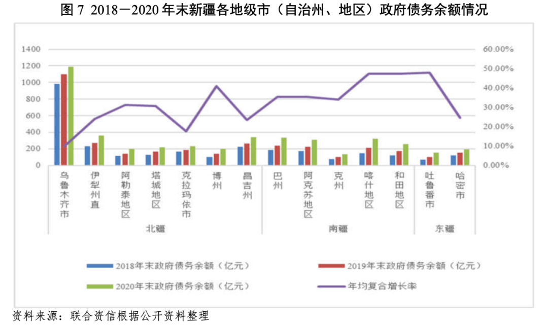 從政府債務(wù)層面看,烏魯木齊市的政府債務(wù)余額顯著高于其他地區(qū)。截至2020年末,烏魯木齊市債務(wù)余額超過千億元,占全省債務(wù)余額的19.25%[3]。此外,伊犁州直、昌吉州、巴州、阿克蘇地區(qū)、喀什地區(qū)債務(wù)余額也相對較高,超過300億元。2018-2020年末,新疆各地級市(自治州、地區(qū))政府債務(wù)余額均持續(xù)增長,除烏魯木齊市外,其余地級市(自治州、地區(qū))年均復(fù)合增長率均超過17%。