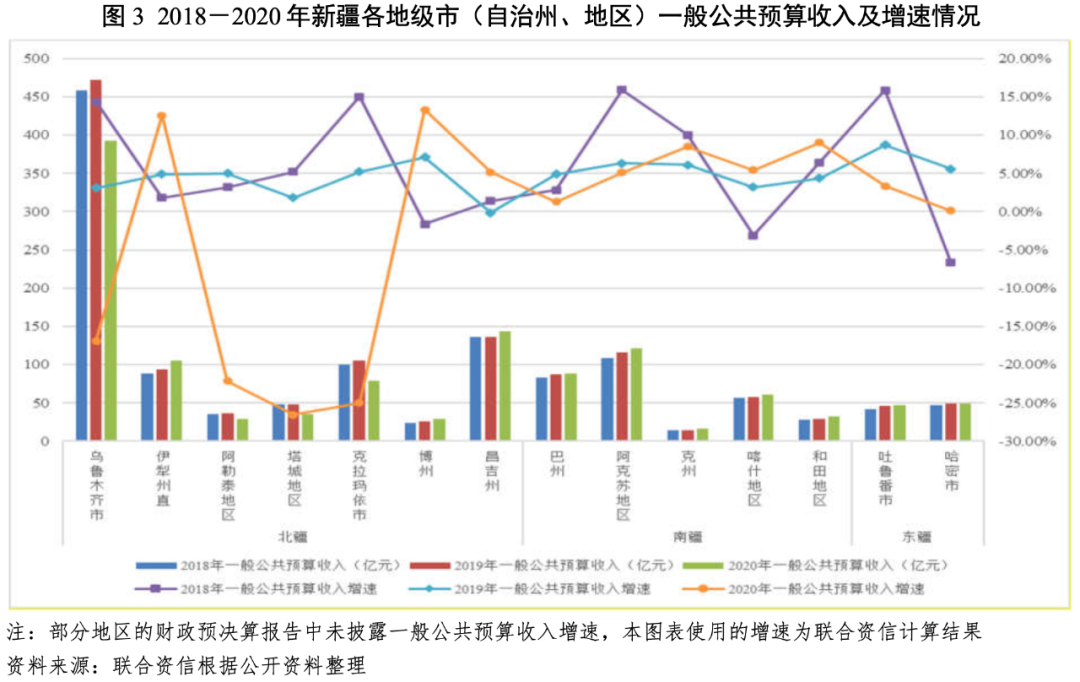 從地級市(自治州、地區(qū))層面看,新疆各地經(jīng)濟和財政發(fā)展相對不均衡,烏魯木齊市經(jīng)濟和財政實力遠高于其他地級市(自治州、地區(qū)),昌吉回族自治州(以下簡稱“昌吉州”)、伊犁哈薩克自治州(以下簡稱“伊犁州”)、阿克蘇地區(qū)經(jīng)濟實力和財政實力相對較強。2020年,受疫情等因素影響,烏魯木齊市、阿勒泰地區(qū)、塔城地區(qū)、克拉瑪依市的一般公共預(yù)算收入降幅較為明顯。新疆各地級市(自治州、地區(qū))政府負債率均持續(xù)增長,烏魯木齊市、克拉瑪依市、博州和吐魯番市政府債務(wù)償還壓力相對較大。
