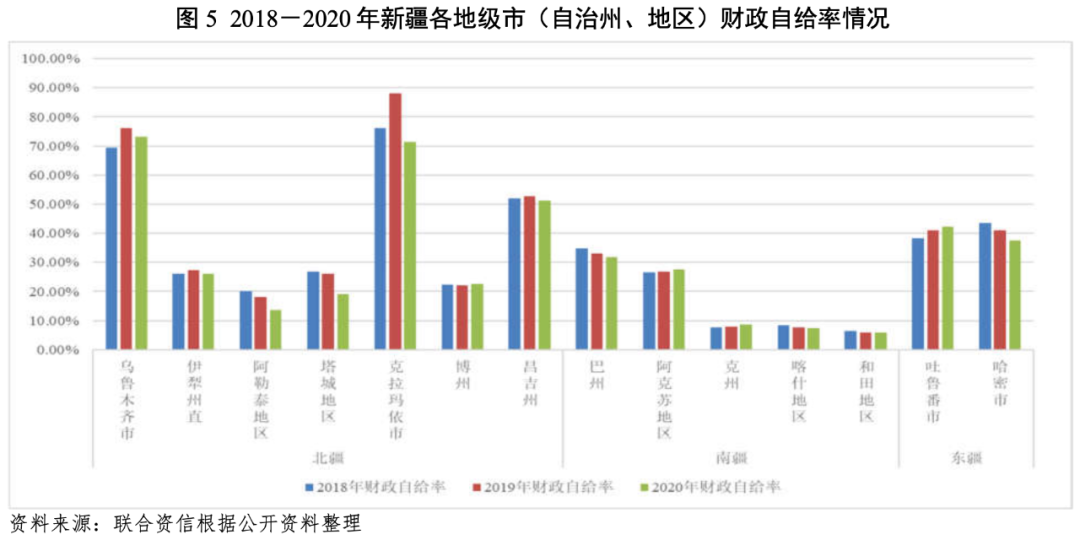 新疆各地級市(自治州、地區(qū))財政實力分化較為明顯,烏魯木齊市的財政收入和債務(wù)規(guī)模遠高于其他地區(qū),昌吉州、伊犁州、阿克蘇地區(qū)財政實力相對較強。2020年,受疫情等因素影響,烏魯木齊市、阿勒泰地區(qū)、塔城地區(qū)、克拉瑪依市的一般公共預(yù)算收入降幅較為明顯。除烏魯木齊市、克拉瑪依市和昌吉州,其余地級市(自治州、地區(qū))財政自給程度較低。新疆各地級市(自治州、地區(qū))政府負債率均有所增長,烏魯木齊市、克拉瑪依市、博州和吐魯番市政府債務(wù)償還壓力相對較大。