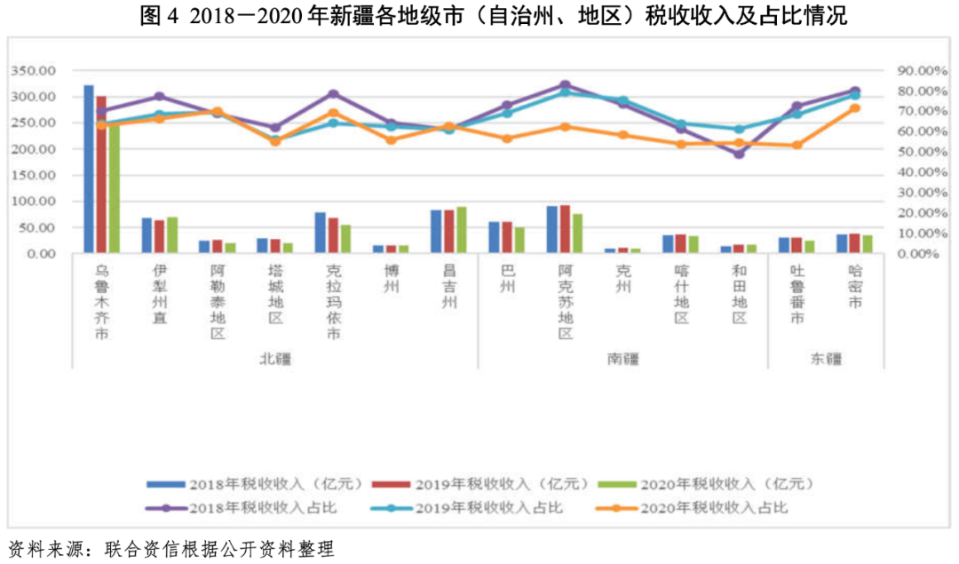 從一般公共預(yù)算收入結(jié)構(gòu)看,2018-2020年,除阿勒泰地區(qū)、克拉瑪依市、昌吉州和和田地區(qū)外,其余地級市(自治州、地區(qū))稅收收入占一般公共預(yù)算收入的比重均有不同程度的下降,2020年各地稅收收入占比分布在50%~72%之間。其中,塔城地區(qū)、博州、巴州、克州、喀什地區(qū)、和田地區(qū)、吐魯番市的稅收收入占比低于60%,一般公共預(yù)算收入的穩(wěn)定性一般。