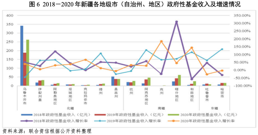 政府性基金收入方面,新疆的政府性基金收入主要集中在烏魯木齊市,2018-2020年烏魯木齊市的政府性基金收入占全新疆的55.68%、35.57%和44.40%。其余地級市(自治州、地區(qū))的政府性基金收入較低。