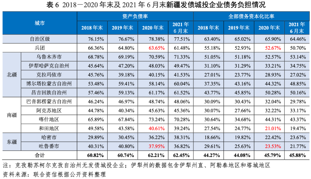 截至2021年6月末,自治區(qū)級、喀什地區(qū)和烏魯木齊市發(fā)債城投企業(yè)資產(chǎn)負債率均在70%以上,省級、兵團、烏魯木齊市和昌吉州發(fā)債城投企業(yè)全部債務(wù)資本化比率均在50%以上,債務(wù)負擔(dān)相對較重。