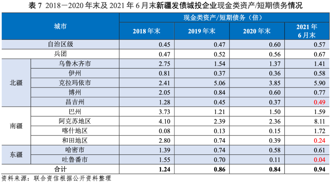 從新疆發(fā)債城投企業(yè)貨幣資金對短期債務(wù)的覆蓋情況看,2020年末,除自治區(qū)級、兵團、巴州和喀什地區(qū)外,其余區(qū)域發(fā)債城投企業(yè)貨幣資金對短期債務(wù)的覆蓋程度較上年末有所下降,整體流動性有所收緊,短期償債壓力加大。