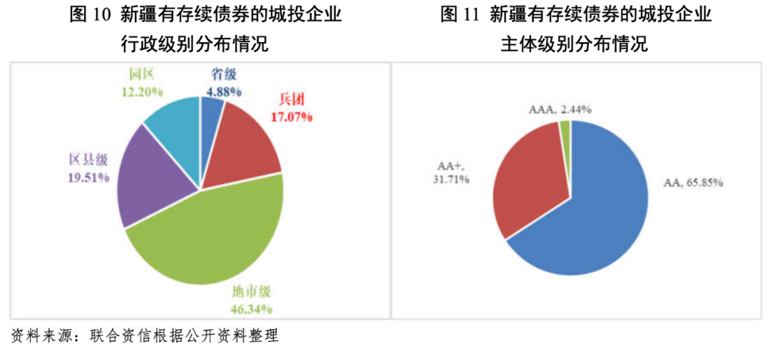 從主體信用級別區(qū)域分布看,新疆發(fā)債城投企業(yè)中AAA級主體1家,為烏魯木齊城市建設(shè)投資(集團)有限公司;AA+級城投企業(yè)13家,其中自治區(qū)級城投企業(yè)2家、兵團級城投企業(yè)2家,烏魯木齊市本級和園區(qū)城投企業(yè)各2家,其余分布在伊犁州、昌吉州、巴州和阿克蘇地區(qū);AA級城投企業(yè)27家,其中兵團級城投企業(yè)5家,伊犁州和烏魯木齊市城投企業(yè)分別為6家和4家,其余分布在昌吉州、阿克蘇地區(qū)、哈密市、巴州、博州、和田地區(qū)、喀什地區(qū)和吐魯番市。