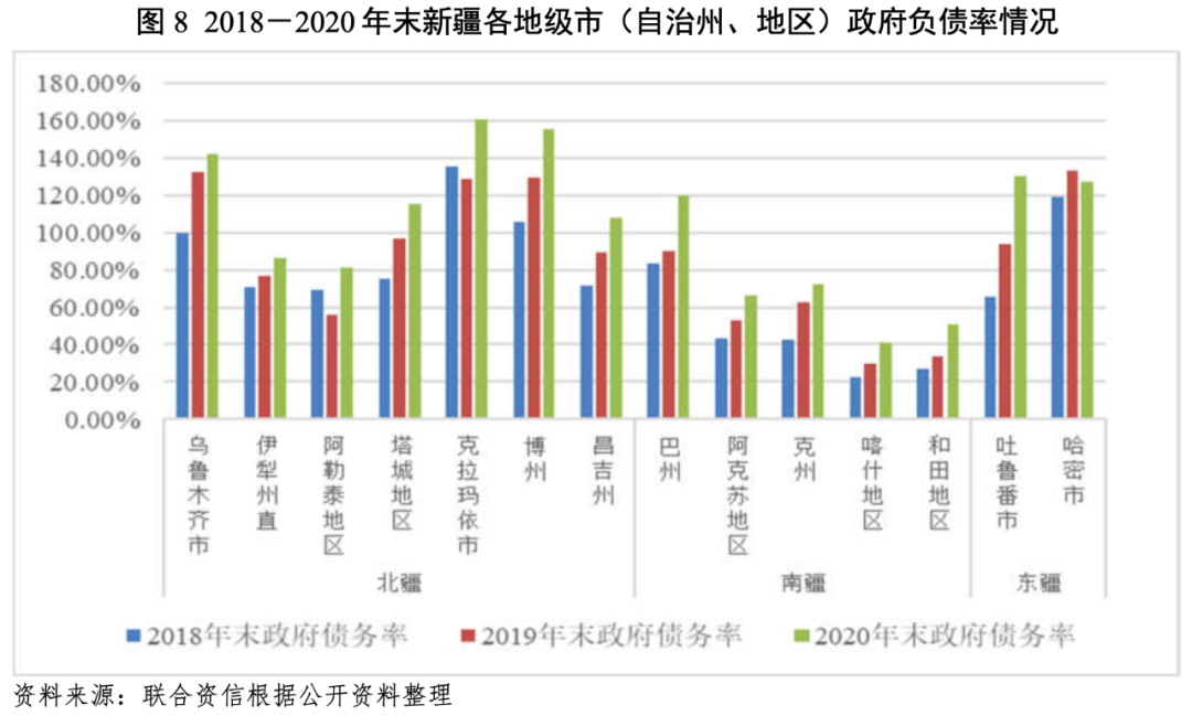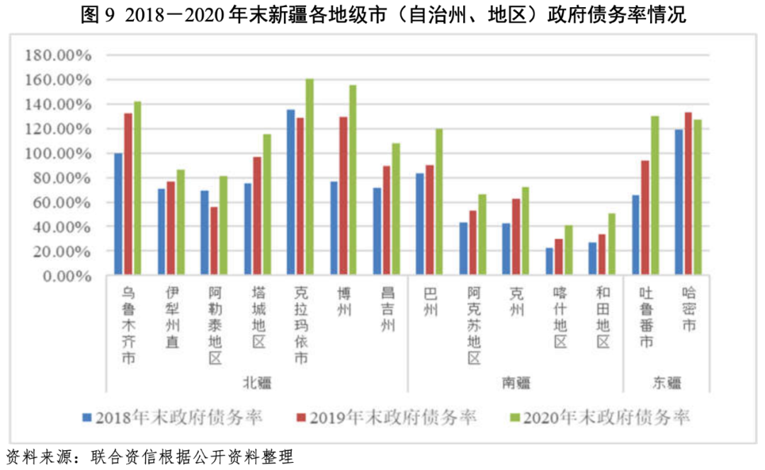 2018-2020年,各地級市(自治州、地區(qū))的政府債務(wù)率均持續(xù)上述或波動上升。烏魯木齊市、克拉瑪依市、博州和吐魯番市2020年末政府債務(wù)率均超過130%,政府債務(wù)償還壓力相對較大。