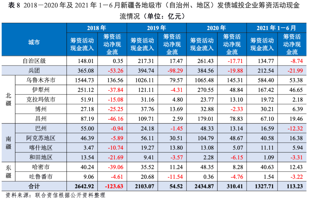 從新疆發(fā)債城投企業(yè)籌資活動凈現(xiàn)金流狀況看,2020年,除自治區(qū)級、兵團、博州、和田地區(qū)和吐魯番市發(fā)債城投企業(yè)整體籌資活動現(xiàn)金流呈凈流出狀態(tài)外,其余地區(qū)發(fā)債城投企業(yè)整體籌資活動現(xiàn)金流均呈凈流入狀態(tài),烏魯木齊市、伊犁州、昌吉州和阿克蘇地區(qū)籌資活動現(xiàn)金流入規(guī)模相對較高。2021年上半年,自治區(qū)級、兵團、巴州、吐魯番市和和田地區(qū)籌資活動現(xiàn)金流為凈流出。綜合看,烏魯木齊市、伊犁州、昌吉州和阿克蘇地區(qū)發(fā)債城投企業(yè)的籌資能力明顯強于其余區(qū)域發(fā)債城投企業(yè),兵團、和田地區(qū)和吐魯番市籌資活動現(xiàn)金流持續(xù)凈流出。