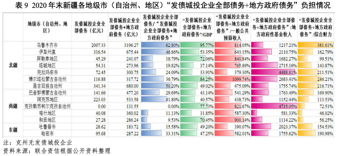 從各地區(qū)債務(wù)負擔(dān)看,“發(fā)債城投企業(yè)全部債務(wù)+地方政府債務(wù)”/GDP的比值相對較高的地級市(自治州、地區(qū))分別為烏魯木齊市、伊犁州直、阿勒泰地區(qū)、博州、克州以及和田地區(qū),均超過50%,債務(wù)負擔(dān)重。