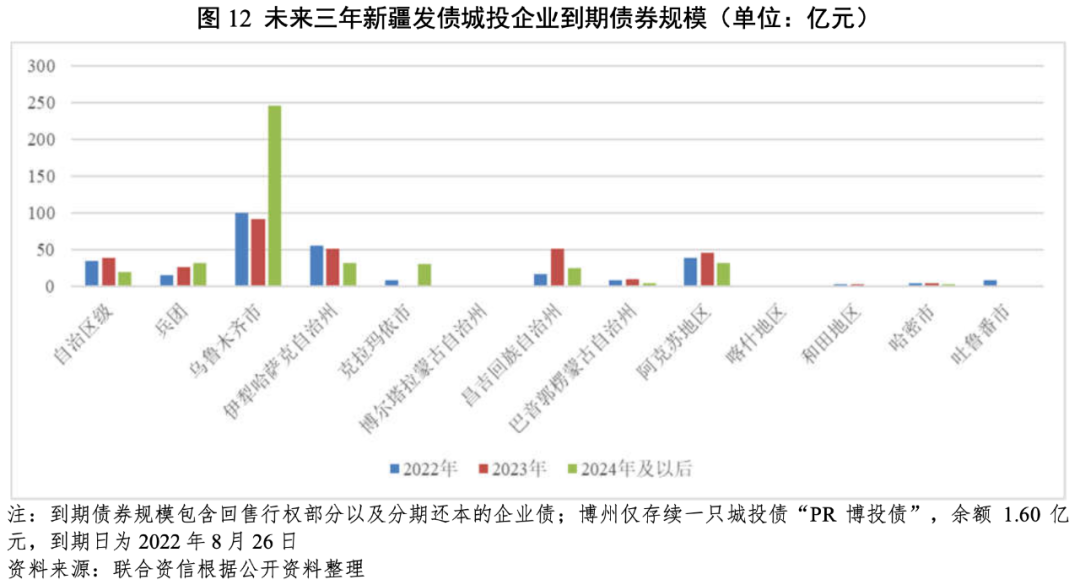 從新疆發(fā)債城投企業(yè)未來三年(2022-2024年)到期債券規(guī)模看,烏魯木齊市和伊犁州的發(fā)債城投企業(yè)未來三年集中到期債券規(guī)模較大,自治區(qū)級、兵團、阿克蘇地區(qū)和昌吉州發(fā)債城投企業(yè)到期債券規(guī)模一般,其他區(qū)域城投企業(yè)到期債券規(guī)模較小。
