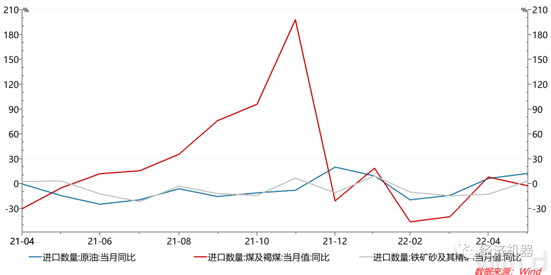 進口超預(yù)期,原油、鐵礦石進口量增速持續(xù)提升。隨著進口的大幅改善,,較上月4.1個百分點,顯著好于0.6其中主要商品中,原油、鐵礦砂進口量增速分別為12.57%,3.15%,較上月提升6和15.8個百分點。煤進口量增速為-2.35%,較上月回落10.7個百分點(圖4)。