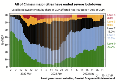 出口增速的大幅反彈主要得益與國內(nèi)疫情控制下,供應(yīng)鏈的恢復(fù)。整體看,經(jīng)過1個月的努力,當前疫情基本得到控制,各地的封鎖正在慢慢解除。重點城市如北京已連續(xù)多日社會面清零,上海近來社會面新增也屈指可數(shù)。在此背景下,上海6月1日開始全面復(fù)工復(fù)市,北京大部分區(qū)域6月6日也宣布正常上班,開放堂食。全國主要城市已經(jīng)結(jié)束嚴重的封鎖,各地的封鎖等級也在不斷下降(圖1)。