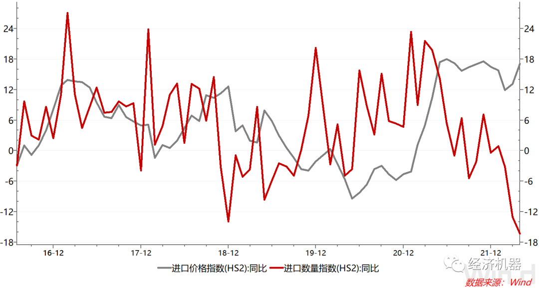 我國原油進口依賴度超70%,鐵礦石依賴超80%。進口增速的持續(xù)回升一部分由于進口需求的恢復(fù),另一部分也可能與這與相關(guān)資源的儲備需求有關(guān)。不過整體上看,進口商品的高昂價格抑制了大部分商品的進口需求(圖5)。