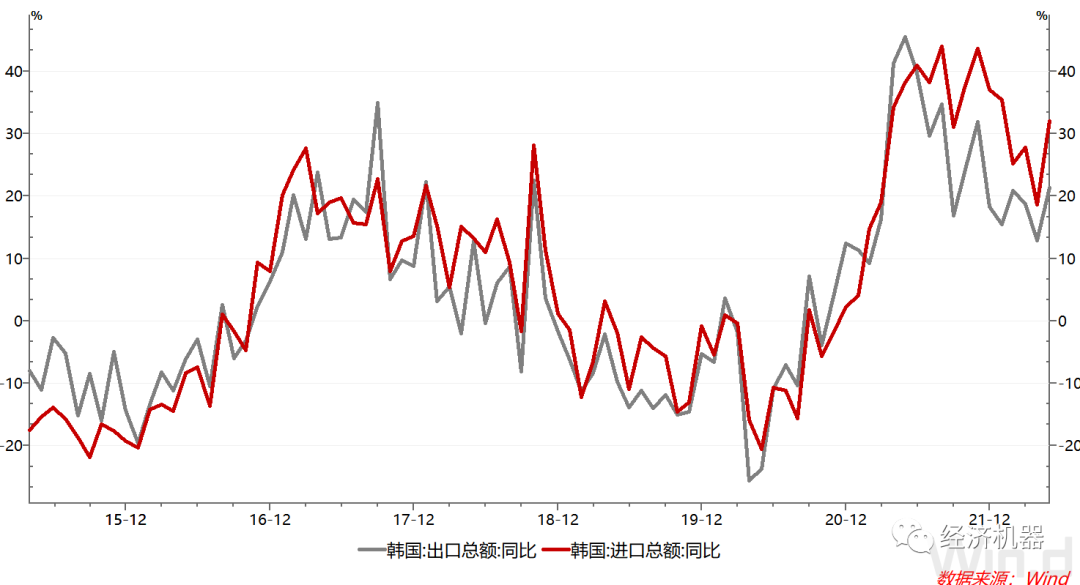 不過,5月,韓國貿(mào)易進出口出現(xiàn)大幅改善。其中,出口同比增速達21.3%,較上月提升8.4個百分點,為年內(nèi)最高水平。進口同比增速達32%,較上月提升13.4個百分點,也是年內(nèi)次高值(圖7)。這可能預(yù)示著外部需求短期內(nèi)局部有所回穩(wěn)。