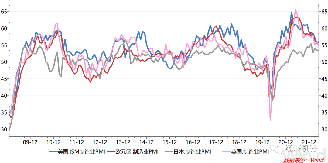海外需求局部有所回穩(wěn)。5月美國ISM PMI為56.1%,較上月增長0.7個百分點,企穩(wěn)反彈。其他主要經(jīng)濟體,如歐盟、日本、英國等,PMI則繼續(xù)回落(圖6)。