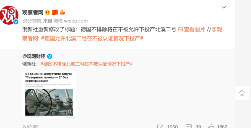 據(jù)觀察者網(wǎng)最新消息,俄新社發(fā)布了一條新聞“德國不排除北溪二號在不被認(rèn)證情況下投產(chǎn)”,不久后俄新社重新修改了標(biāo)題:“德國不排除將在不被允許下投產(chǎn)北溪二號。”